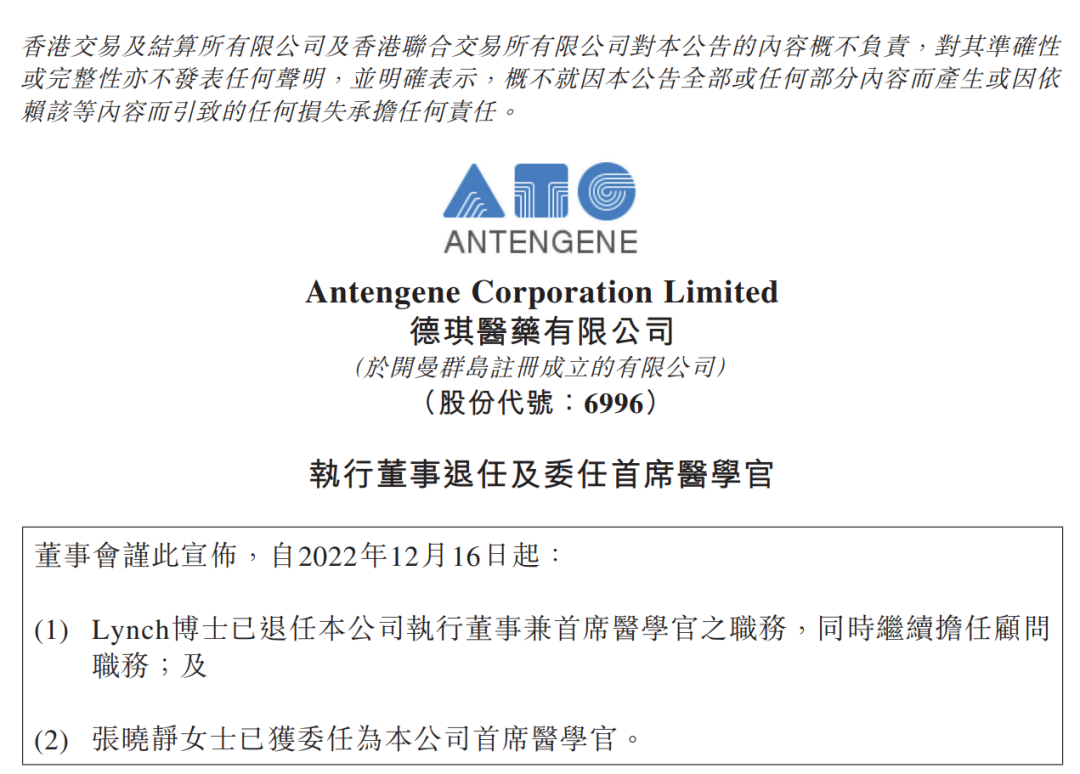 德琪医药有限公司(「本公司」)董事会(「董事会」)宣布,由于退休原因,Kevin Patrick Lynch博士(「Lynch博士」)已辞任本公司执行董事兼首席医学官(「首席医学官」)之职务,同时继续担任本公司顾问之职务,自2022年12月16日起生效。