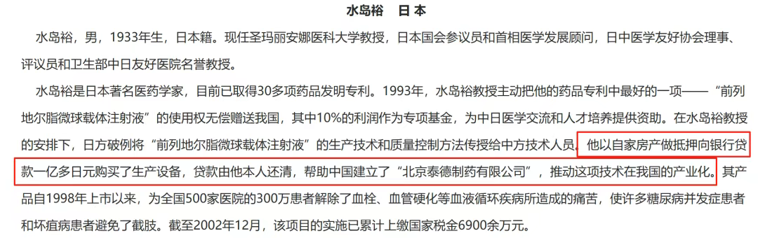 据科学技术部官网记载:水岛裕在1993年的时候主动将其最成功的产品“前列地尔脂微球载体注射液”的专利无偿赠送给我国(泰德制药),还让专人来国内传授技术,甚至还抵押了自家房产为泰德制药购置生产设备,由此才有了泰德制药以及泰德制药的第一款产品““前列地尔脂微球载体注射液”。