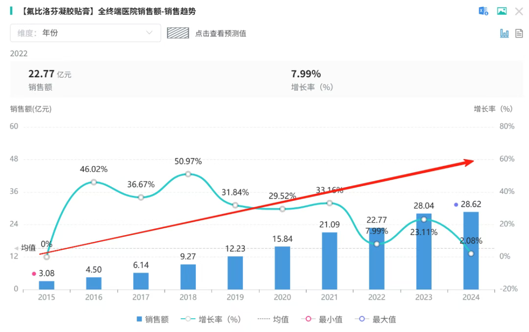 数据可以说明一切。据摩熵医药数据库统计,2015-2024年期间,氟比洛芬凝胶贴膏销售额从3亿飙升至30亿元,十年复合增速高达42%,大单品由此造就。