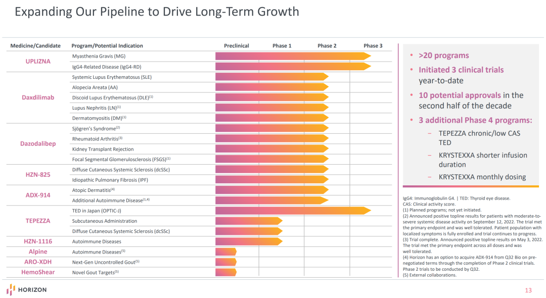 Horizon Therapeutics公布的2022 Q3财报给出了主要财务数据、产品销售情况,以及研发管线,如下: