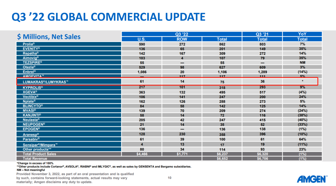 安进(AMGEN)此前拿下了全球首款上市的KRAS G12C抑制剂LUMAKRAS®/LUMYKRAS™(sotorasib),2022年Q3销售数据如下: