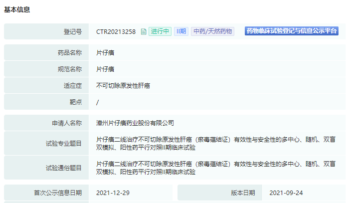 目前,片仔癀正在开展一项片仔癀二线治疗不可切除原发性肝癌(瘀毒蕴结证)有效性与安全性的多中心、随机、双盲双模拟、阳性药平行对照II期临床研究。