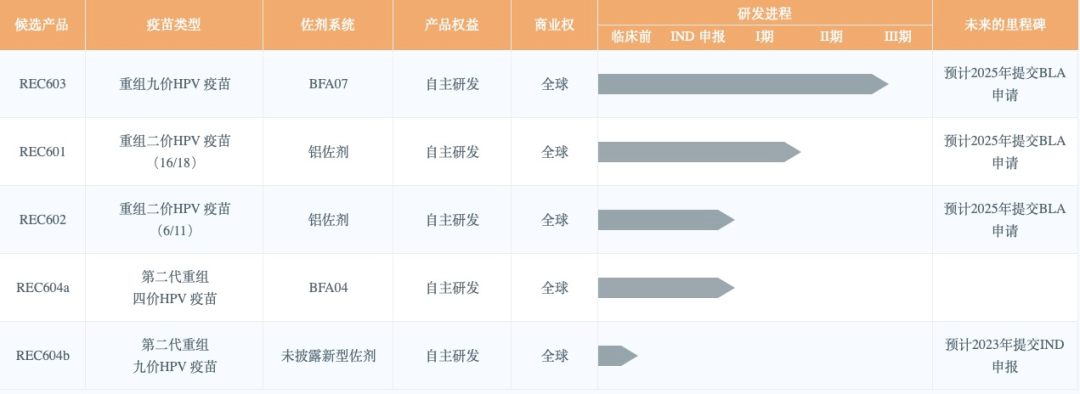 瑞科生物深耕疫苗领域多年,已构建先进的新型佐剂、蛋白工程和免疫评价三大创新技术平台。公司以新型佐剂平台为核心,与抗原优化设计和免疫评价技术相协同,持续开发性能领先的重磅疫苗品种。透过强大的研发能力,公司已建立由10余款高度差异化组成的高价值创新型疫苗组合,覆盖宫颈癌、带状疱疹、新冠肺炎、肺结核等具有重大负担的疾病领域。核心产品重组HPV九价疫苗REC603,目前正处于III期临床试验阶段。新冠疫苗ReCOV也在今年进入III期临床,预计明年可递交EUA/BLA申请。