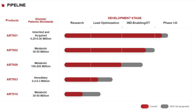 另一款核心产品为ART002,严重杂合子家族性高胆固醇血症(HeFH)——尤其针对超高基线(LDL-C>6 mM)且对现有药物响应不佳的患者。根据2025年2月的数据显示,全球同类产品中首个在此适应症上安全实现饱和药效的产品,已进入临床试验。