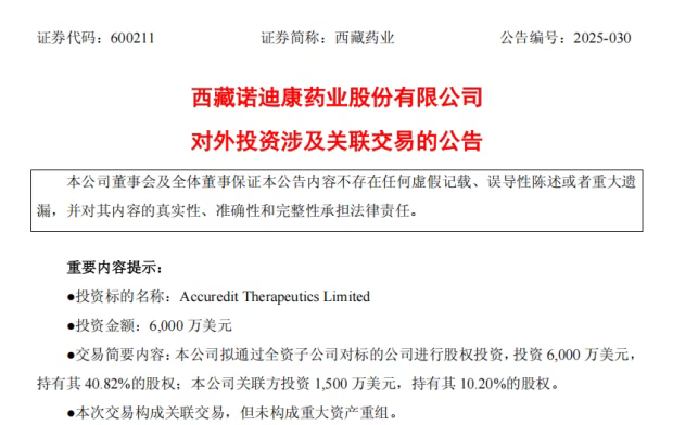 这家传统药企的股价爆发并非空穴来风。2025年8月28日,西藏药业宣布通过全资子公司对锐正基因进行股权投资,投资6000万美元持有40.82%的股权,关联方康哲药业拟投资1500万美元,持有10.20%的股权,二者合计持有锐正基因51%的股权,实现共同控股。