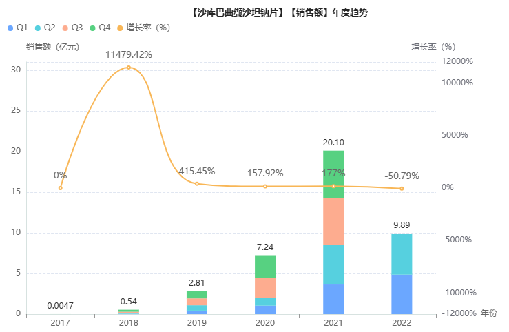 而在国内,沙库巴曲缬沙坦钠于2017年进入中国市场(商品名:诺欣妥),后被纳入2020年国家医保目录,2021年6月,在中国率先获批用于原发性高血压治疗。2021年,院内销售额一举突破20亿元,同比增长177%。
