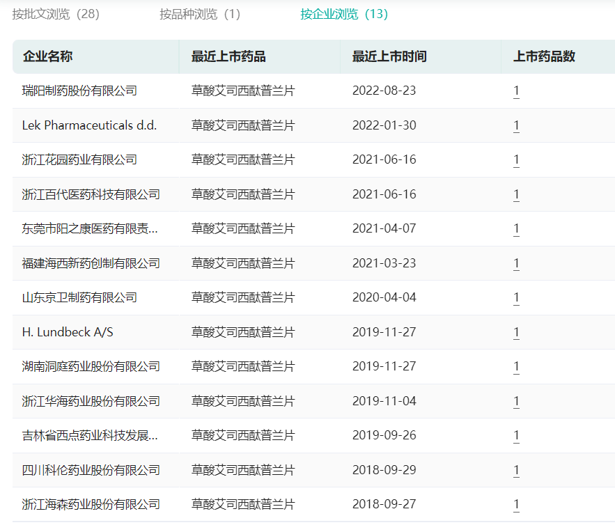 草酸艾司西酞普兰片国内上市批文情况(按企业)