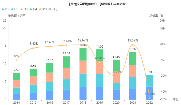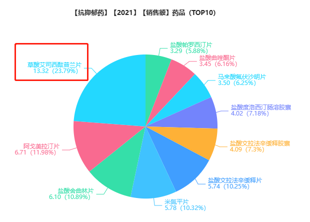 据2019年世界卫生组织(WHO)数据,全球几乎每20人中就有1人可能患有抑郁症。而在国内,有数据显示,中国抑郁症患者数量已经超过9500万人,每年有20万人因抑郁症自杀。据药融云统计,2021年抗抑郁药物院内市场销售总额超66亿元,其中,草酸艾司西酞普兰片以13.3亿元的销售额问鼎榜首。
