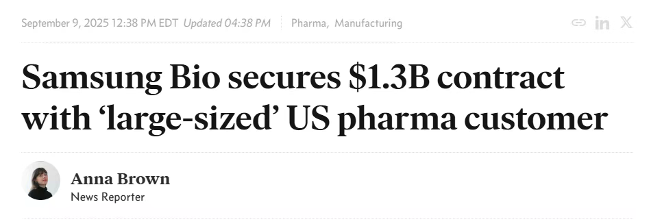2025年9月9日,三星生物在韩国宣布与一家美国制药公司达成了一项价值12.9464亿美元的委托生产协议。这份合同是三星生物自成立以来规模第二大的订单,预计持续至2029年12月31日。由于合同中包含保密条款,客户及产品的具体信息并未公开。