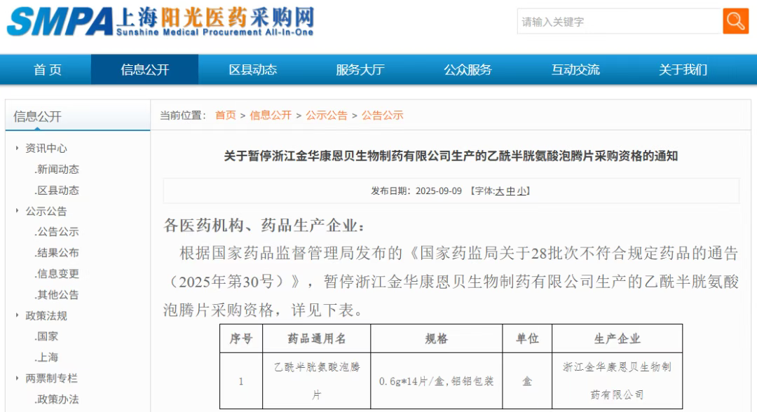 9月9日,上海阳光医药采购网公示,暂停浙江金华康恩贝生物制药有限公司生产的乙酰半胱氨酸泡腾片采购资格。乙酰半胱氨酸2023年院内销售额超48亿元,康恩贝是其泡腾片销售的TOP1企业,此次暂停采购或将引起市场格局的短暂变动。