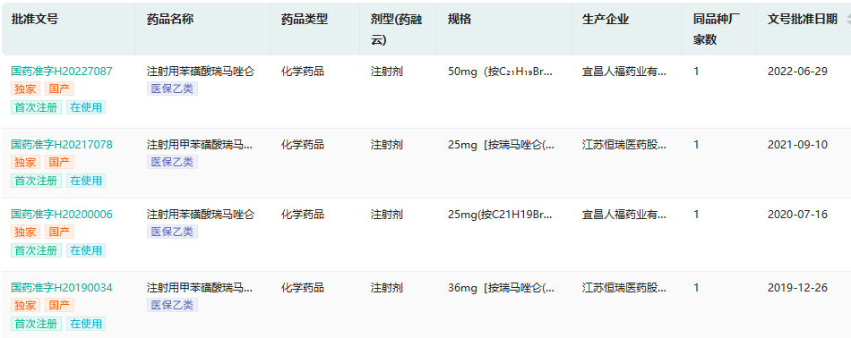 目前国内瑞马唑仑相关产品仅有恒瑞医药与人福药业两家企业获批生产,均为各自的独家产品。