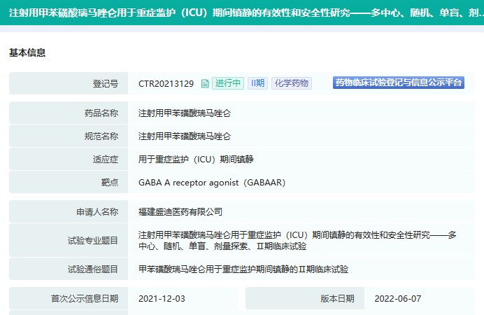 取得先发优势的恒瑞医药,并未止步于此,目前瑞倍宁正在进行针对重症监护(ICU)期间镇静的II期临床试验。