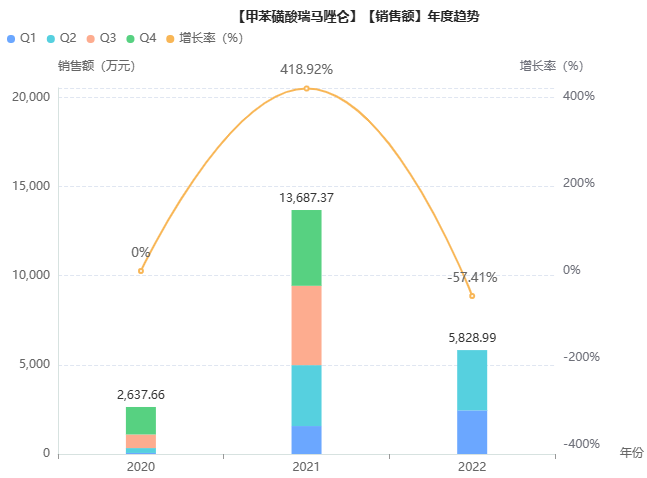 瑞倍宁已被纳入医保目录(乙类),用于胃镜、结肠镜检查的镇静。药融云全国医院销售数据显示,瑞倍宁上市后销售额一路高歌猛进,2021年销售额便已突破亿元大关,同比增长418%,市场前景见好。