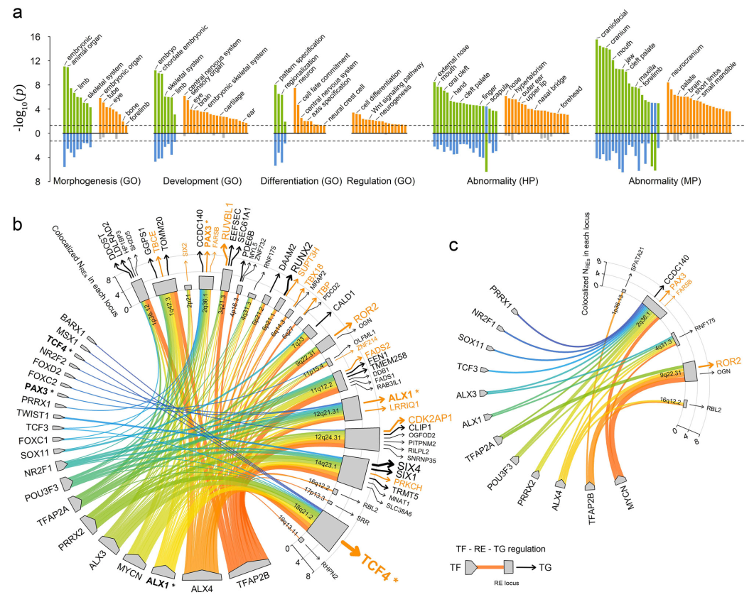 C-GWAS与标准GWAS确定的候选基因所富集到的生物通路与表型(a)和与CNCC中调控网络重叠情况(b,c)的比较