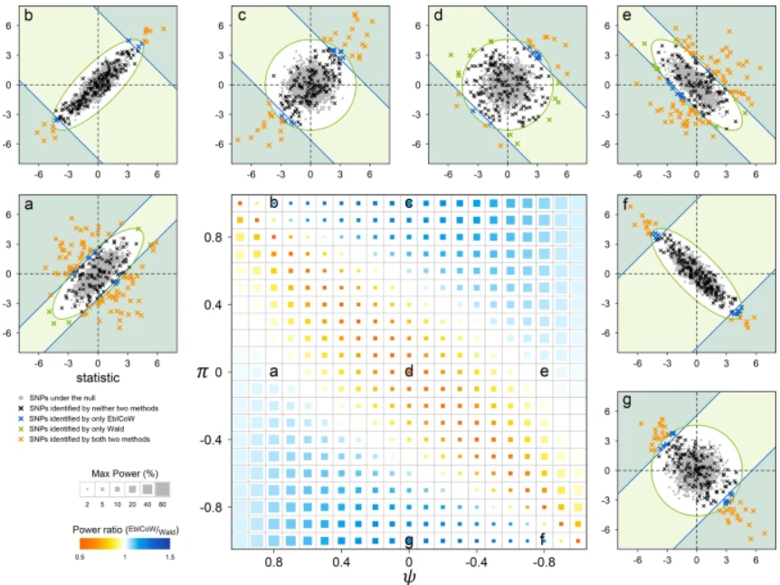 在方法设计层面,作者对多维GWAS统计量构成的相关性矩阵进行了分解,来区分由可解释遗传因素导致的 “效应相关性” 和由不可解释与非遗传因素导致的 “背景相关性”,进而依据效应和背景相关性相对强度优选合适的统计量进行集成分析,同时引入自适应迭代算法以甄别部分遗传变异仅对特定表型子集有效应的情况,从而实现对遗传多效性检出率的最大化。为了克服由于多重迭代优选引起的统计量膨胀,作者通过计算机模拟获得统计量在零假设下的真实分布,并利用其与均一分布的对应关系,对最终观测到的统计量进行校正,确保了C-GWAS结果和标准GWAS结果可直接在相同显著阈值下进行比较。通过大规模数据模拟发现,与多种其它方法相比,C-GWAS在不同复杂场景下的统计功效和稳定性均展示出明显提升。