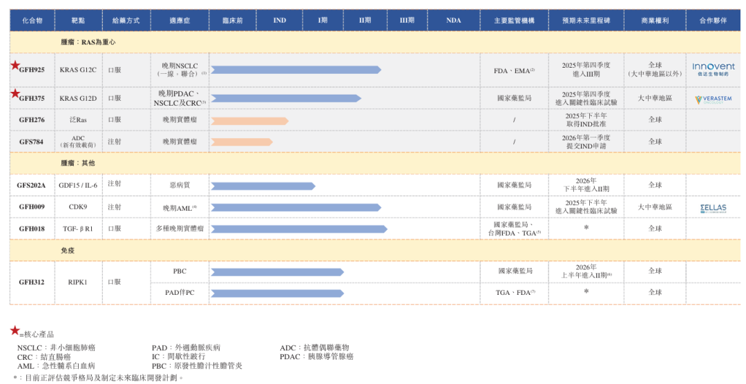 除核心产品外,劲方医药致力于进一步丰富其产品管线组合以超越RAS药物矩阵,例如GFS202A(其自行开发的针对GDF15和IL-6的双特异性抗体)、GFH312(一款自主研发的强效小分子药物),能针对受体相互作用的丝氨酸/苏氨酸蛋白激酶1(RIPK1)并抑制其激酶活性。目前劲方医药已获得国家药监局的批准,在中国开展治疗原发性胆汁性胆管炎(PBC)的GFH312 II期临床。