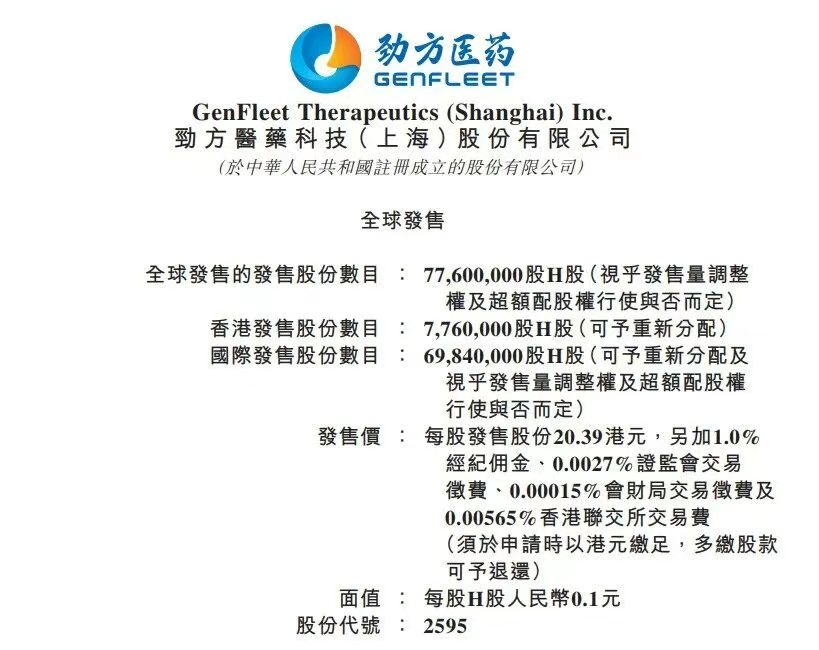 9月11日,劲方医药发布公告:公司拟全球发售7760万股H股,中国香港发售股份776万股,国际发售股份6984万股;2025年9月11日至9月16日招股;发售价将为每股发售股份20.39港元,每手买卖单位为200股,发售募资约15.82亿港元(约合2.03亿美元),募资净额预计14.43亿港元。劲方医药将于9月19日上午正式在港股上市。