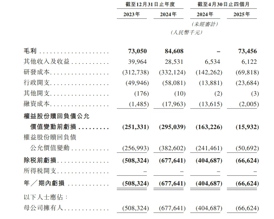 截至2023年及2024年12月31日止年度,以及截至2024年及2025年4月30日止四个月,年/期内亏损总额分别为人民币5.083亿元及人民币6.776亿元、人民币4.047亿元及人民币0.666亿元。于往绩记录期间录得的净亏损及其波动主要与(i)该公司对研发活动的大量投资;及(ii)由于该公司价值上升而导致的权益股份赎回负债公允价值变动有关。