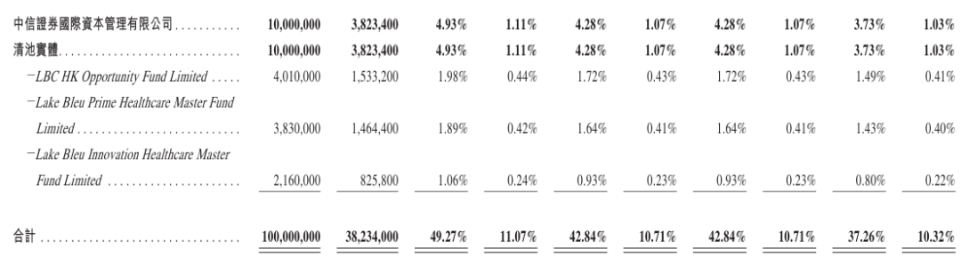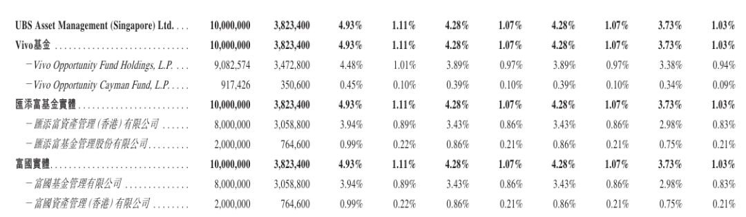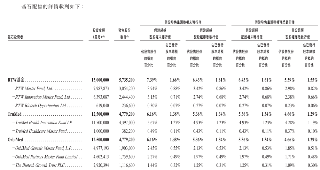 RTW基金、TruMed、OrbiMed、UBS Asset Management (Singapore) Ltd、Vivo基金、汇添富基金实体、富国实体、中信证券国际资本管理有限公司、清池实体已同意以发售价认购合共约1亿美元(或约7亿7,963万港元)可购买的发售股份数目,假设发售价为每股股份20.39港元(即招股章程所载指示性发售价),则基石投资者将予认购的发售股份总数将为38,234,000股发售股份,占49.27%(假设超额配股未获行使)。