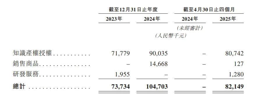 财务方面,截至2023年及2024年12月31日止年度,以及截至2025年4月30日止四个月的收入分别为人民币7370万元、人民币1.047亿元及人民币8210万元。其中提到,截至2024年4月30日止四个月,公司并未实现收入。2023年公司营收主要来自对外授权合作,其中知识产权授权收入约7178万元,占比逾九成。