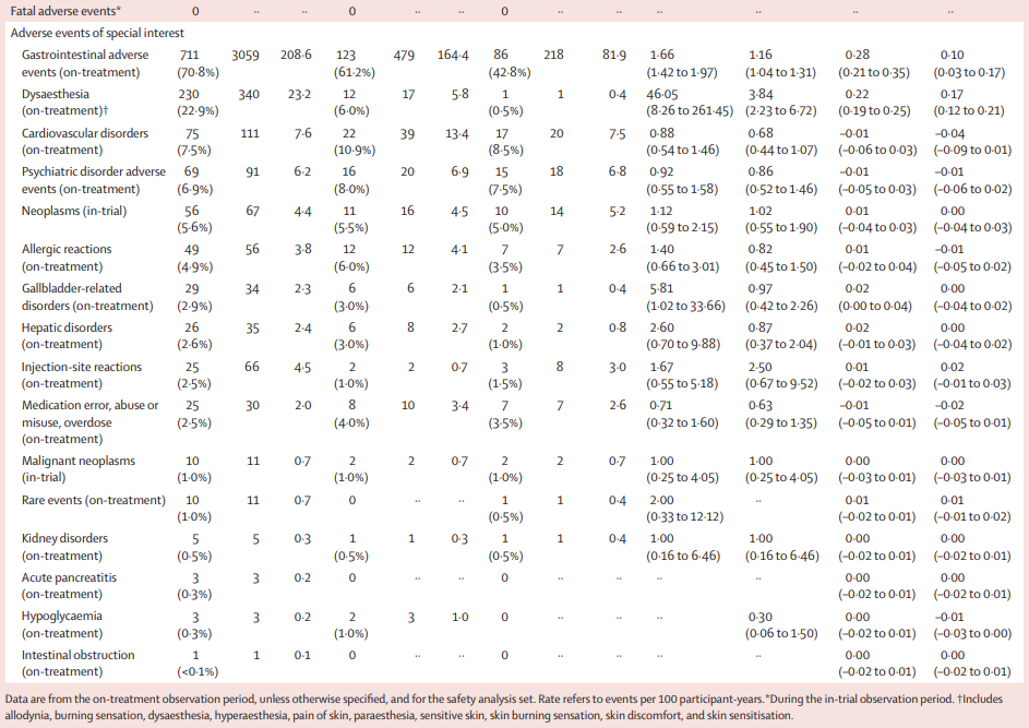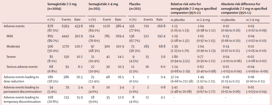 在不良反应方面,司美格鲁肽7.2 mg组、2.4 mg组和安慰剂组胃肠道不良事件(AE)的发生率分别为70.8%、61.2%和42.8%;因这些AE停药的发生率分别为3.3%、2.0%和0%。严重AE的发生率分别为6.8%、10.9%和5.5%。