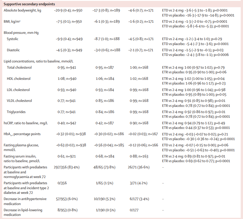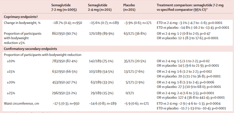 主要主要终点从基线到第72周司美格鲁肽7.2 mg组与安慰剂相比,体重变化百分比和体重下降5 %或以上的受试者比例。确认性次要终点包括7.2 mg组与2.4 mg组相比体重变化百分比和腰围变化;与安慰剂组相比体重减轻10%或以上、15%或以上、20%或以上和25%或以上的受试者比例;与2.4 mg组相比体重减轻20%或以上和25%或以上的受试者比例。