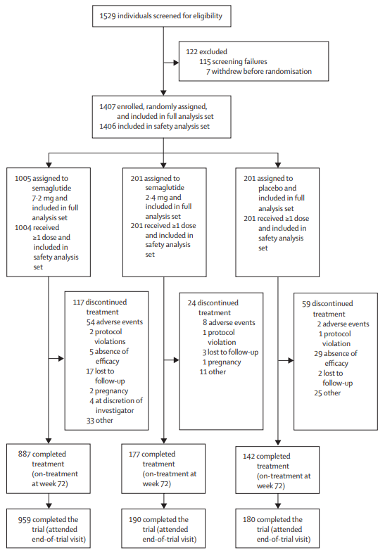 受试者按 5:1:1 的比例随机分配,每周皮下注射一次司美格鲁肽 7.2 mg、2.4 mg 或安慰剂,并均接受饮食咨询、增加体力活动等生活方式干预,疗程72周。