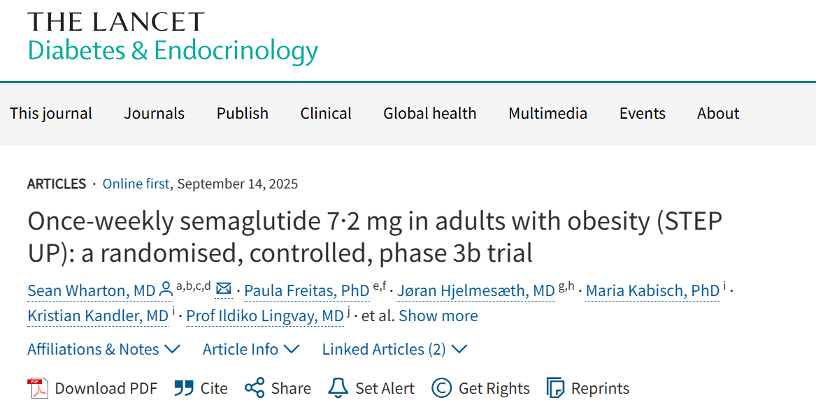 近日,发表在《The Lancet Diabetes & Endocrinology》(《柳叶刀·糖尿病与内分泌学》)期刊上的大规模国际III期临床试验STEP UP的结果显示,对于现有治疗效果不佳、体重仍未充分下降的肥胖人群(包括2型糖尿病患者),每周接受更高剂量的司美格鲁肽(7.2 mg)可显著改善其体重情况和相关健康结果。