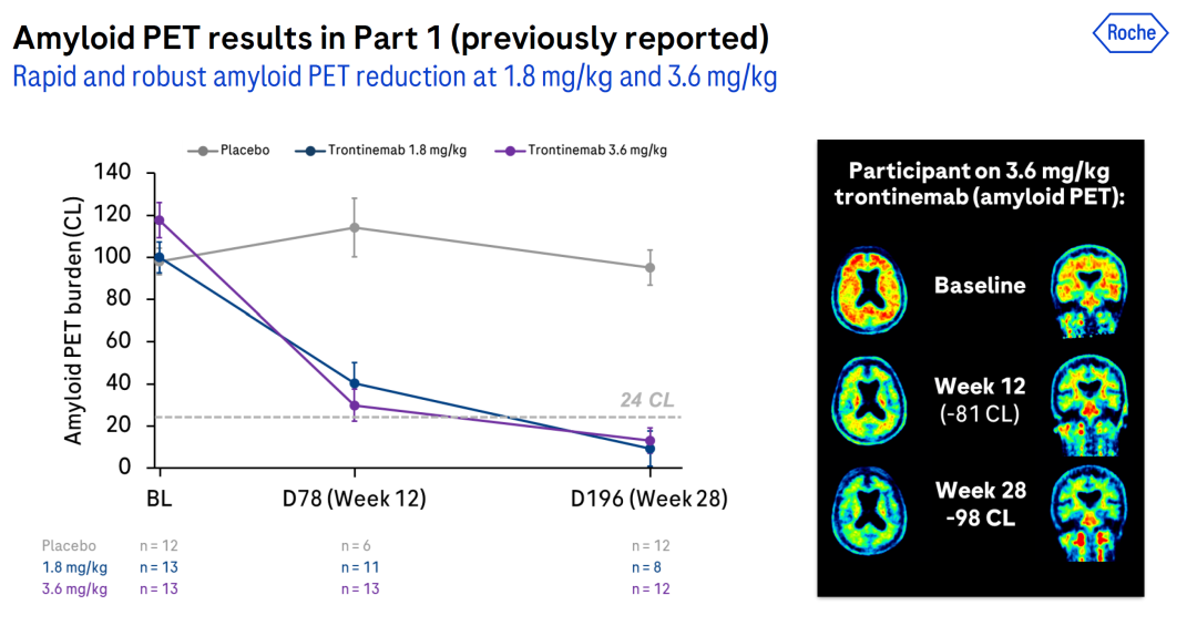 在先前的报道中,trontinemab在1.8 mg/kg和3.6 mg/kg剂量下,与安慰剂相比,在治疗12周和28周后,能够迅速且显著地减少淀粉样蛋白。