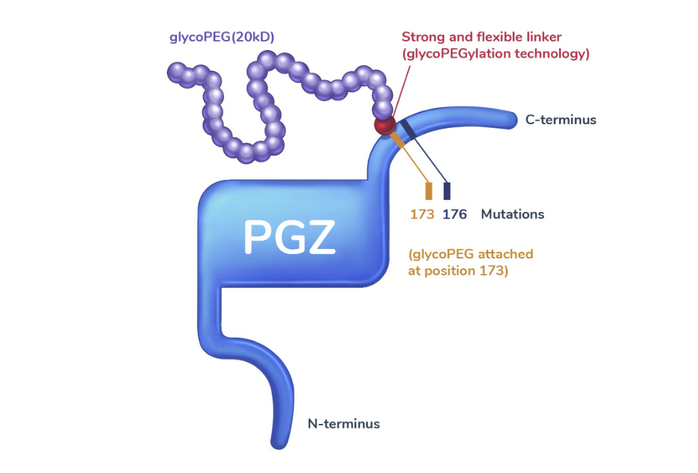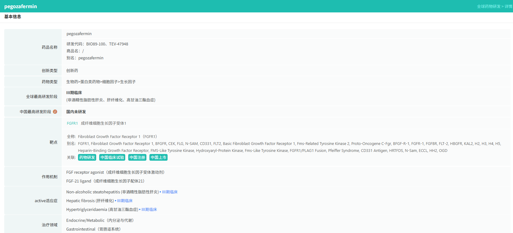 Pegozafermin(研发代码:BIO89-100,曾称TEV-47948)是一种在研究的成纤维细胞生长因子 21(FGF21)类似物,其使用糖聚乙二醇化技术进行工程设计,具有位点特异性突变,包含天然 FGF21 激素的活性特征并延长半衰期。本品最早由Teva(梯瓦)开发,后转让权益于89bio,相关专利WO-2019043457。