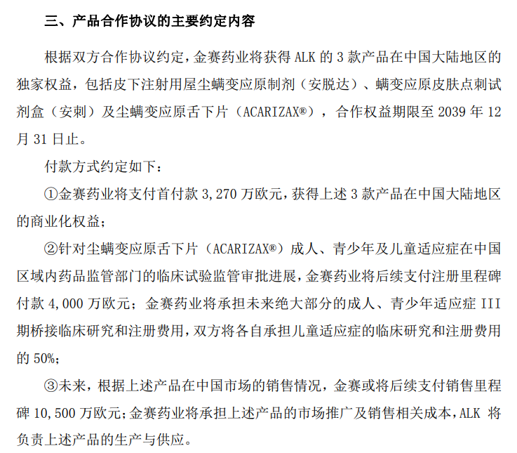 未来,根据上述产品在中国市场的销售情况,金赛或将后续支付销售里程碑10,500万欧元;金赛药业将承担上述产品的市场推广及销售相关成本,ALK将负责上述产品的生产与供应。