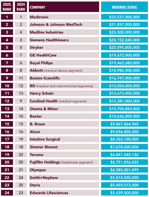近日,医疗器械行业网站 Medical Design & Outsourcing 发布2025年全球医疗器械公司百强榜(Medtech Big 100)。