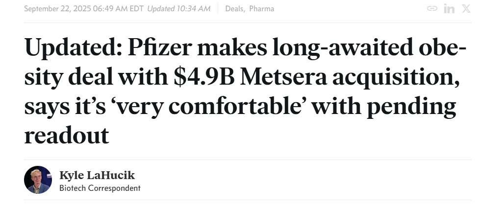 9月22日,据外媒报道,美国医药巨头辉瑞公司接近对抗肥胖药物制造商Metsera Inc (NASDAQ:MTSR)发起73亿美元的收购要约,这可能是前者两年来最大的一笔交易,同时也将使其在减肥药市场获得优势。