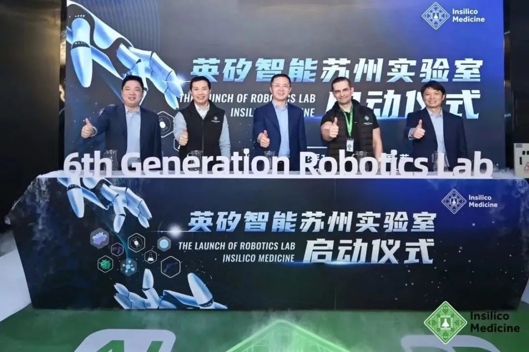 (左起)华平资本合伙人施珑、英矽智能联合首席执行官兼首席科学官任峰、苏州工业园区党工委委员、管委会副主任倪乾、英矽智能创始人兼联合首席执行官Alex Zhavoronkov、苏州工业园区生物产业发展有限公司董事长、总裁殷建国共同揭幕