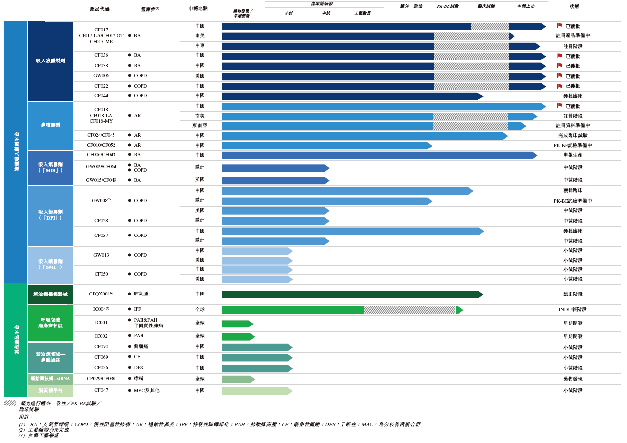 获得美国FDA批准上市的有GW006(治疗慢性阻塞性肺病(COPD)的阿福特罗雾化溶液)、CF018为中国首个获批用于治疗中重度过敏性鼻炎的氮䓬斯汀氟替卡松鼻喷雾剂。