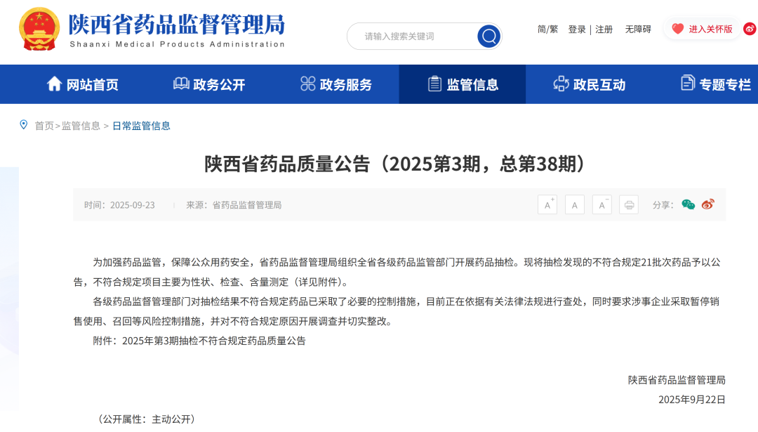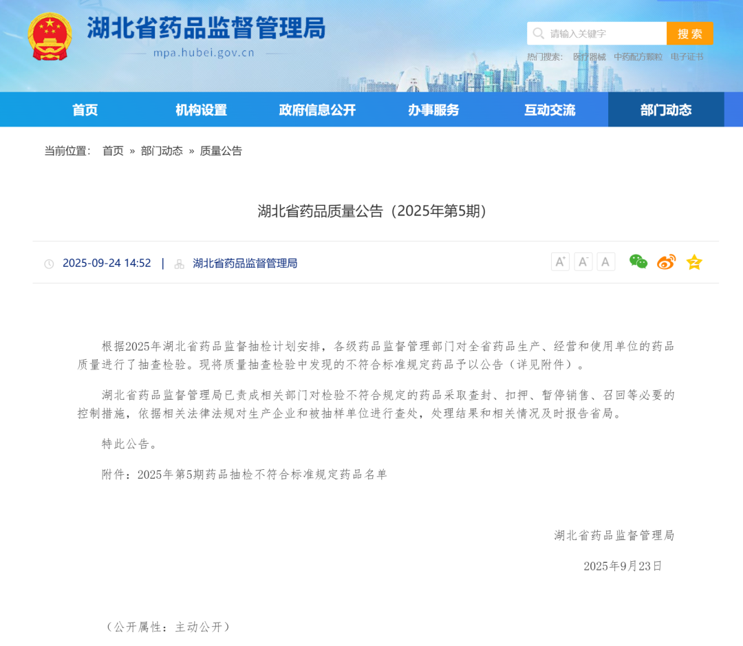 9月23-24日,陕西省药品质量公告(2025第3期,总第38期)和湖北省药品质量公告(2025年第5期)发布。