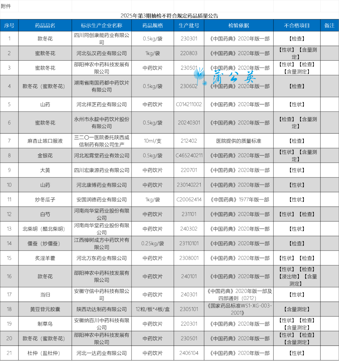 21个品种:款冬花(2批次)、白芍、北柴胡(醋北柴胡)、炒冬瓜子、大黄、当归、杜仲(盐杜仲)、僵蚕(炒僵蚕)、金银花、款冬花(蜜款冬花)(2批次)、蜜款冬花(3批次)、山药(2批次)、制草乌、炙淫羊藿;黄豆苷元胶囊、麻杏止咳口服液。