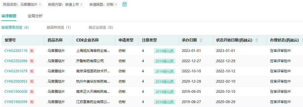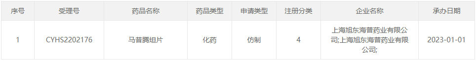 2023年1月1日,国家CDE官网显示,上海旭东海普以仿制4类报产的马昔腾坦片获得受理。此前在2022年12月27日,齐鲁制药也以仿制4类报产的马昔腾坦片获得受理。至此,已有6家药企先后递交了该亿元罕见病药物的仿制药上市申请,均在审评审批中。目前国内的马昔腾坦仅原研获批生产销售,本土药企中谁家将会抢先冲线,拿下国内首仿药呢?