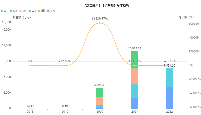 在中国,爱可泰隆于2016年12月向NMPA提交马昔腾坦上市申请,2017年5月被列入自查名单中,2017年10月获批上市,2018年3月,爱可泰隆宣布马昔腾坦正式上市,目前该产品在国内仅有原研生产销售。据药融云统计,2021年马昔腾坦在国内院内销售额突破亿元,增长率高达173.92%。今年H1的销售额已比肩去年前三个季度,预计2022年将依旧保持高速增长趋势。