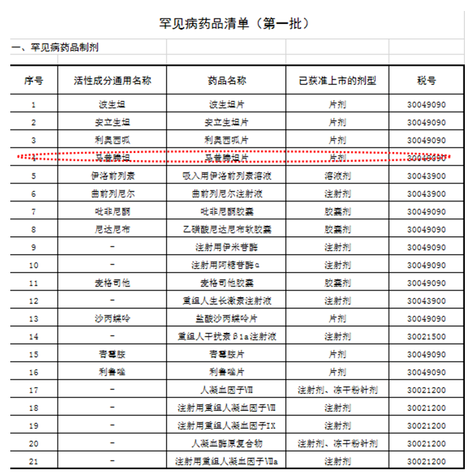 2019年2月22日,财政部、海关总署、税务总局、药监局联合发布《关于罕见病药品增值税政策的通知》,马昔腾坦位列首批罕见病药品清单。期待国产仿制药能够早日上市,给患者带来更多的高质量低价格的购药选择。特别是首仿药,如果作为“全国首家通过一致性评价”上市,将有利于提升该药品的市场竞争力,为其将来销售增长奠定坚实的基础。