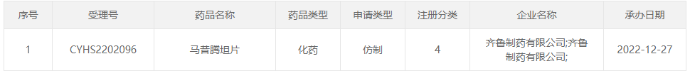 值得一提的是,2020年4月,上海宣泰的马昔腾坦片(规格10mg)的ANDA申请获美国FDA暂定批准,批文号为ANDA 211026。上海宣泰的马昔腾坦片是美国首仿药,目前美国原研产品化合物专利还在专利保护期内,获得最终批准后于美国市场上市销售。