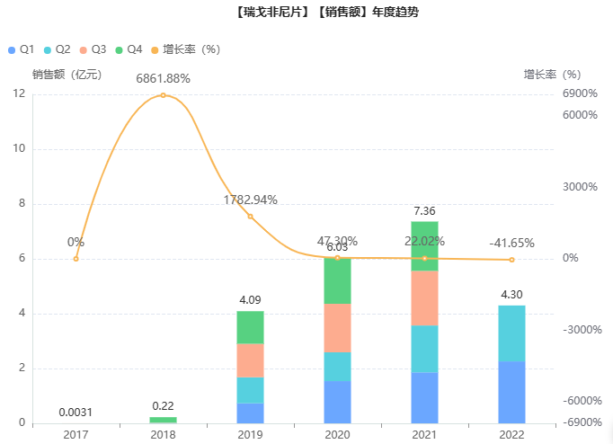 在国内,瑞戈非尼片最早于2017年获批上市,2018年10月10日,瑞格非尼正式进入国家医保乙类报销目录,限用于肝细胞癌二线治疗、转移性结直肠癌三线治疗和胃肠道间质瘤三线治疗。在医保降价后价格为196元(40mg/片),降幅45.56%。次年,瑞戈非尼片在院内的销售额一举突破4亿元,随后稳定增长,2021年院内销售额超7亿元,同比增长22%。