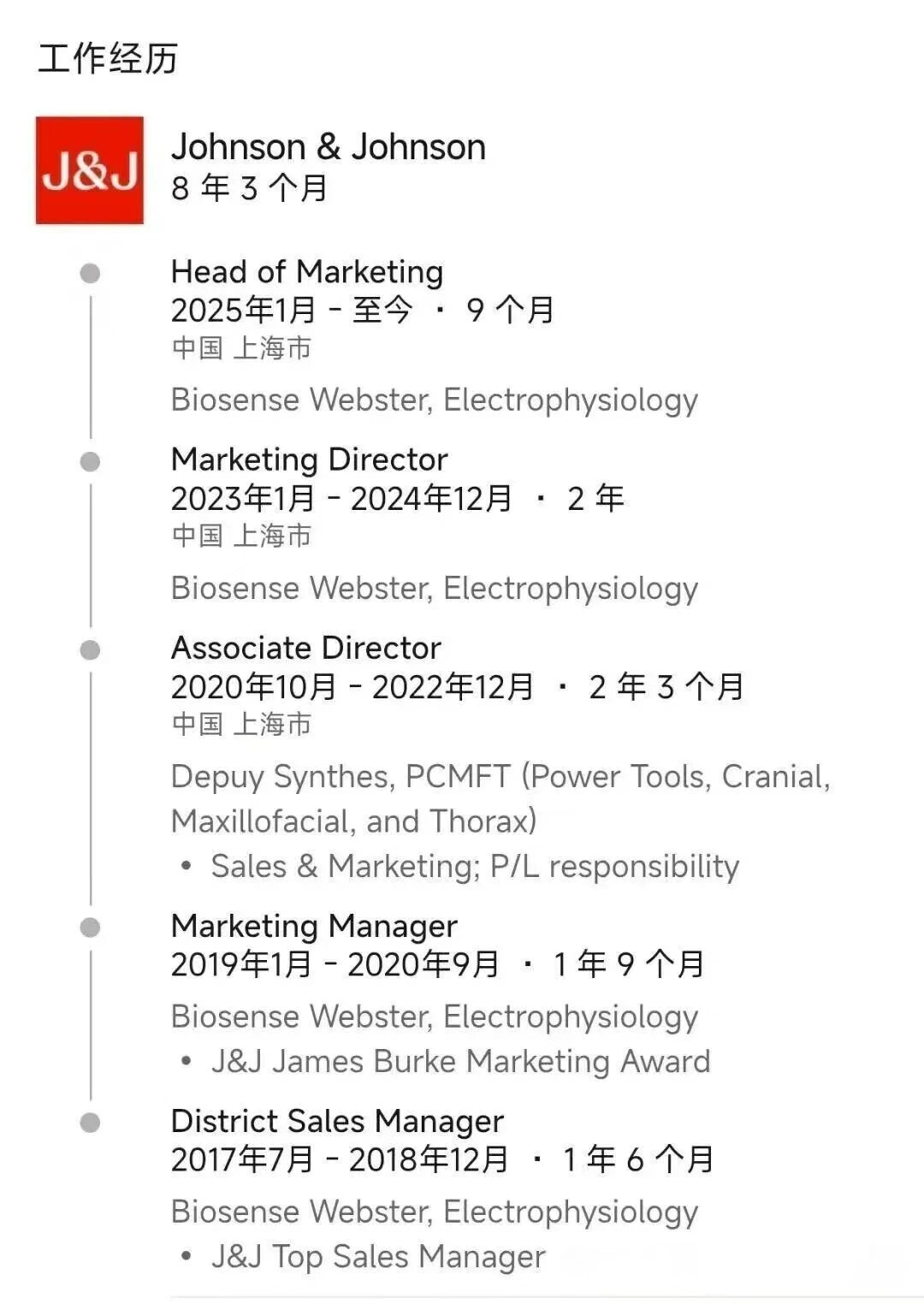 陈楚晖同样曾在强生医疗科技任职。在加入GE医疗之前,陈楚晖曾担任强生医疗科技中国公司的心血管和专业解决方案事业部总经理,同时负责对外事务及市场准入工作,24年9月正式告别强生。