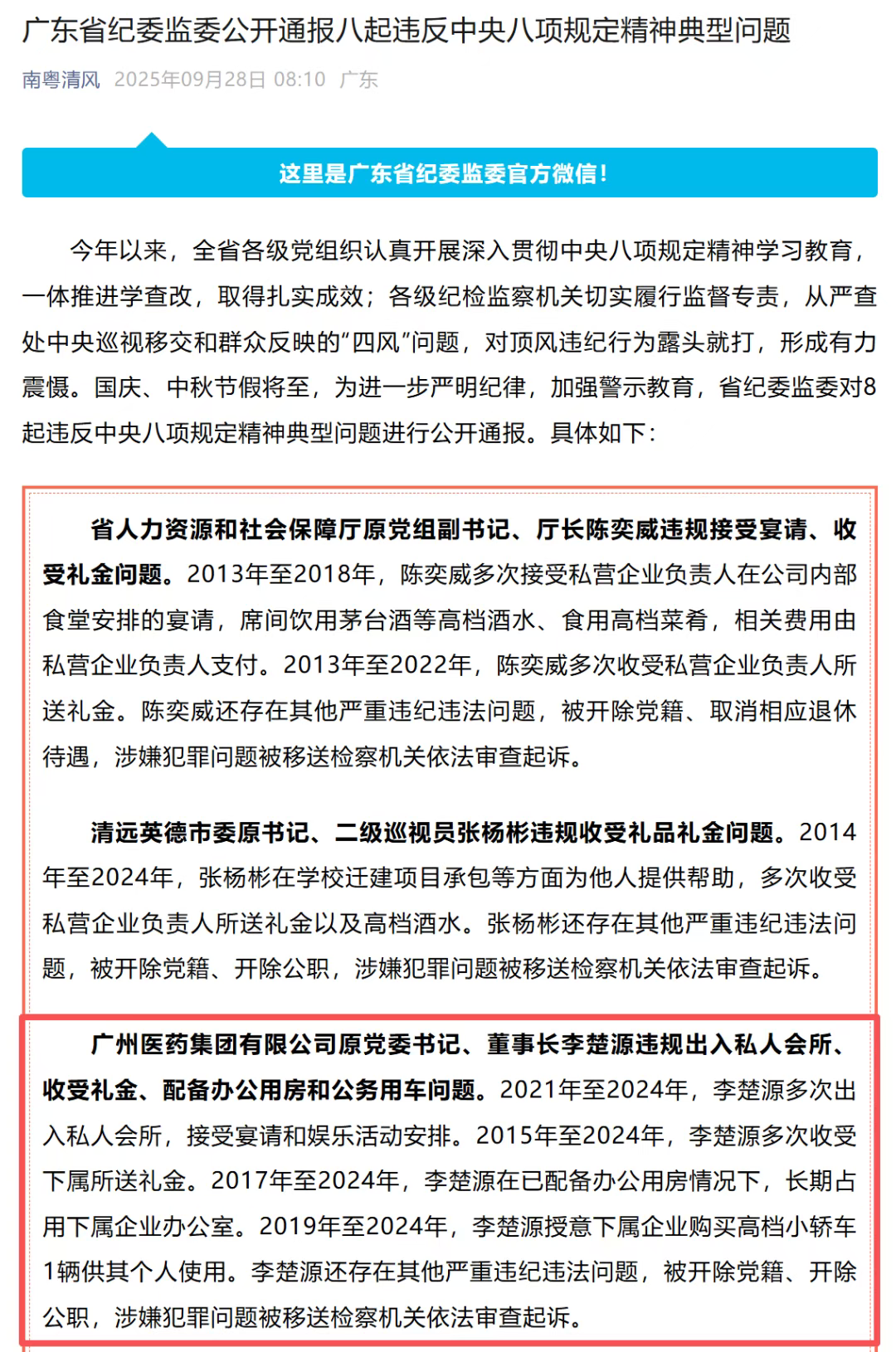 9月28日,据“南粤清风”微信公众号消息,广东省纪委监委通报八起违反中央八项规定精神的典型问题。广州医药集团有限公司原党委书记、董事长李楚源因严重违纪违法被列入通报。