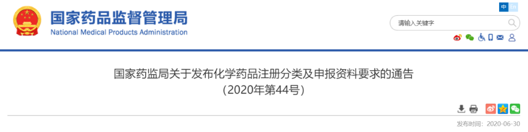 为配合《药品注册管理办法》实施,国家药品监督管理局组织制定了《化学药品注册分类及申报资料要求》,现予发布,并说明如下。一、关于化学药品注册分类,自2020年7月1日起实施。二、关于化学药品注册申报资料要求,自2020年10月1日起实施。在2020年9月30日前,可按原要求提交申报资料。特此通告。附件:化学药品注册分类及申报资料要求