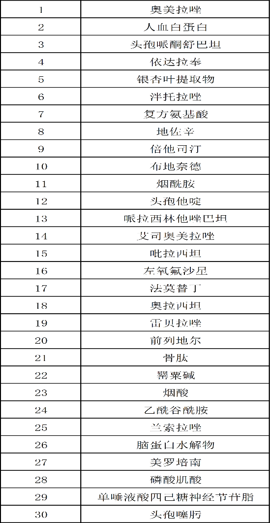 其中,奥美拉唑、人血白蛋白、头孢哌酮舒巴坦、依达拉奉等30个临床常用大品种被纳入。相比于第一批重点监控合理用药目录,脑苷肌肽、小牛血清去蛋白、复合辅酶、丹参川穹嗪、转化糖电解质、鼠神经生长因子、胸腺五肽、核糖核酸II、曲克芦丁脑蛋白水解物、核糖核酸、长春西汀、马来酸桂哌齐特、小牛血去蛋白提取物13个品种则被调出。