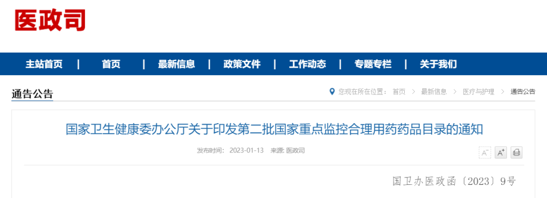 2023年1月12日晚,国家卫生健康委办公厅关于印发第二批国家重点监控合理用药目录,要求对纳入本目录的药品制定完善临床应用指南,明确临床应用的条件和原则,加强合理用药监管。距离第一批目录发布,时间已经过去大概3年半左右。