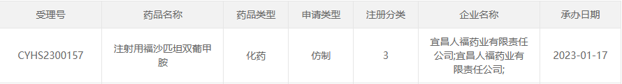 1月17日,据CDE官网显示,人福医药控股子公司——宜昌人福药业,递交的注射用福沙匹坦双葡甲胺3类仿制药申报上市申请获受理。据药融云统计,该5亿化疗止吐药的院内九成市场由豪森与正大天晴占据,此次人福医药正式向其发起挑战,若顺利的话,将会成为国内第五家获批企业,进行生产销售后,或将会打破两者在市场的“霸主”地位。