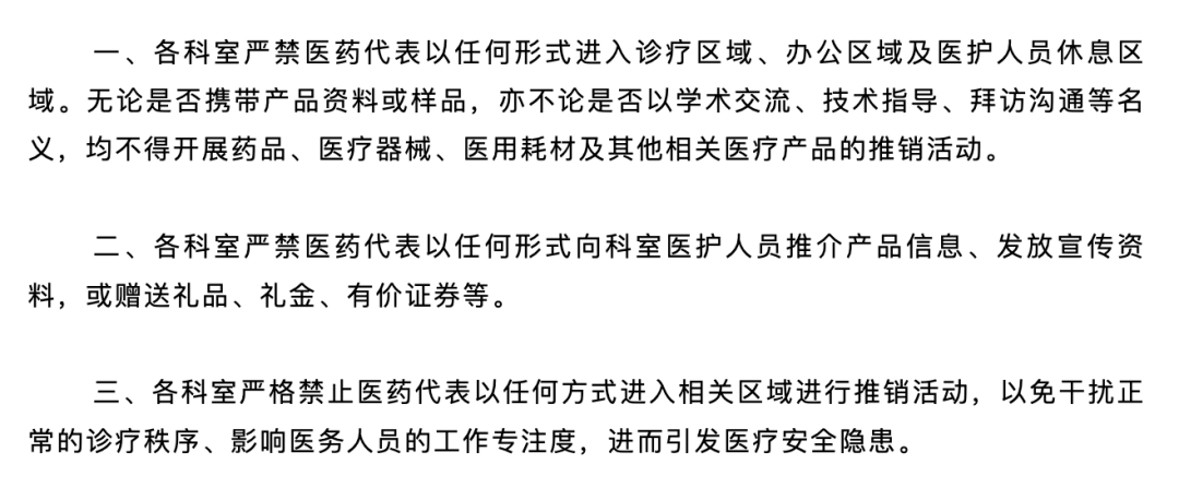 其中包括,各科室严禁医药代表以任何形式进入诊疗区域、办公区域及医护人员休息区域。医药代表进院被严格限制。