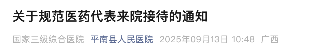 赛柏蓝观察发现,不止太湖县中医院,当前已有多地医院针对医药代表来院接待制定了明确规范。例如广西平南县人民医院规定,医药代表到院来访需在“每月第三周周四”的接待日前7天,向医院行风办提交预约申请,经审批同意后方可接待,严禁未经批准私自与院内相关部门或个人接触、开展违规推销。